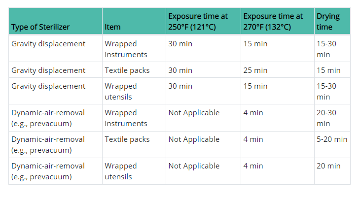 Different types of autoclaves deliver different sterilization time. There are three types of steam sterilization cycles recognized by the Association for the Advancement of Medical Instrumentation (AAMI). The minimum cycle times of dental sterilizer varies depending on temperature, different types of sterile instruments (wrapped or unwrapped), and manufacturer’s instructions. Some of the steam sterilizers are “intelligent” enough to shorter cycle times or reducing the number of sterilization cycles by certain manual activities.